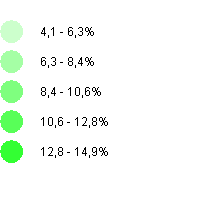 Durch Mausklick auf die gewünschte Partei wird der Stimmenanteil in % durch farbliche Abstufung in der Landkarte dargestellt.
